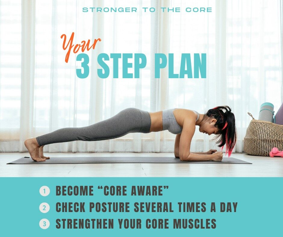 Sitting or standing tall helps keep your core muscles in balance. Plus, it can improve your breathing & your energy level.
